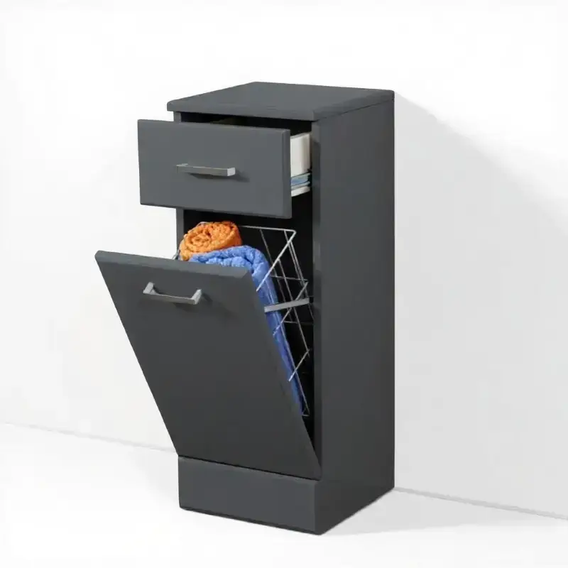 This multi-functional bathroom cabinet offers a smart storage solution without taking up much space. The integrated laundry basket keeps dirty clothes out of sight, while the drawer helps keep smaller items organized.