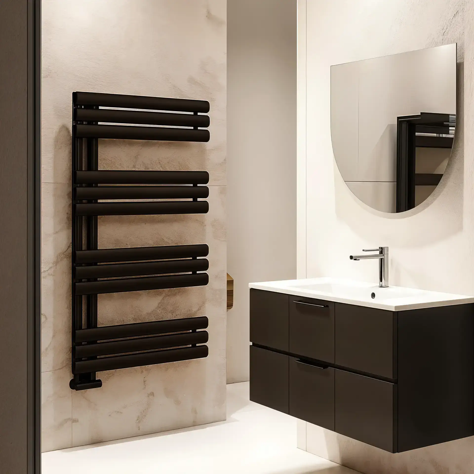 The Luxury D Shape Black Radiator delivers both sophistication and functionality — an ideal heating solution for any stylish bathroom environment.